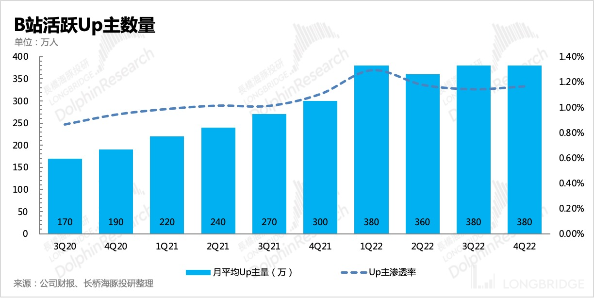年初的激励规则调整,使得今年以来 Up 主的增长受到了不小的压力。四季度 Up 主勉强活维持在 380 万人。