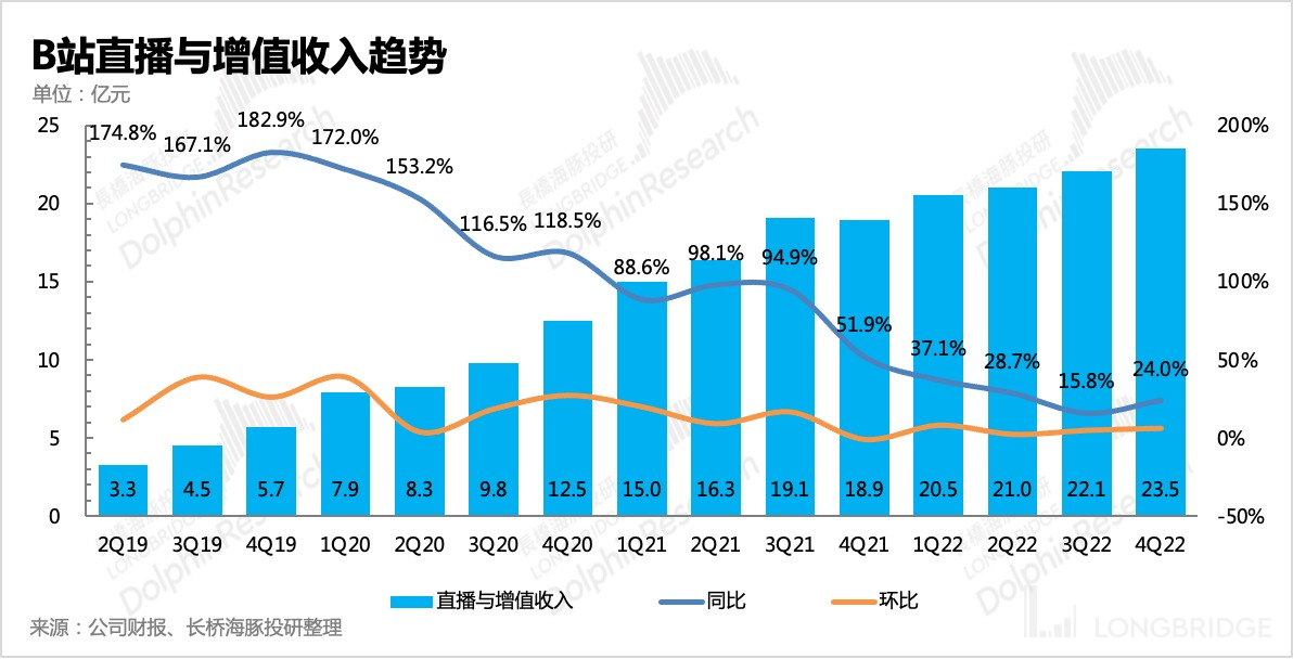 四季度直播增值收入 23.5 亿元,同比增长 24%,又是最稳健那个。从大会员的数量变动来看,猜测主要由直播收入推动。虽然秀场直播夕阳行业,但 B 站还处于渗透早期,因此增速并不难看。再加上团队也一直在做付费点的挖掘,加深商业化。