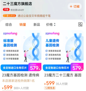 对于其他消费基因检测公司来说,若没有足够给力的外部销售渠道,大抵只能通过自己开拓市场,销量惨淡。如下图所示,23魔方天猫旗舰店销冠产品,总售出量只有300+,排名第二的产品仅35人付款。