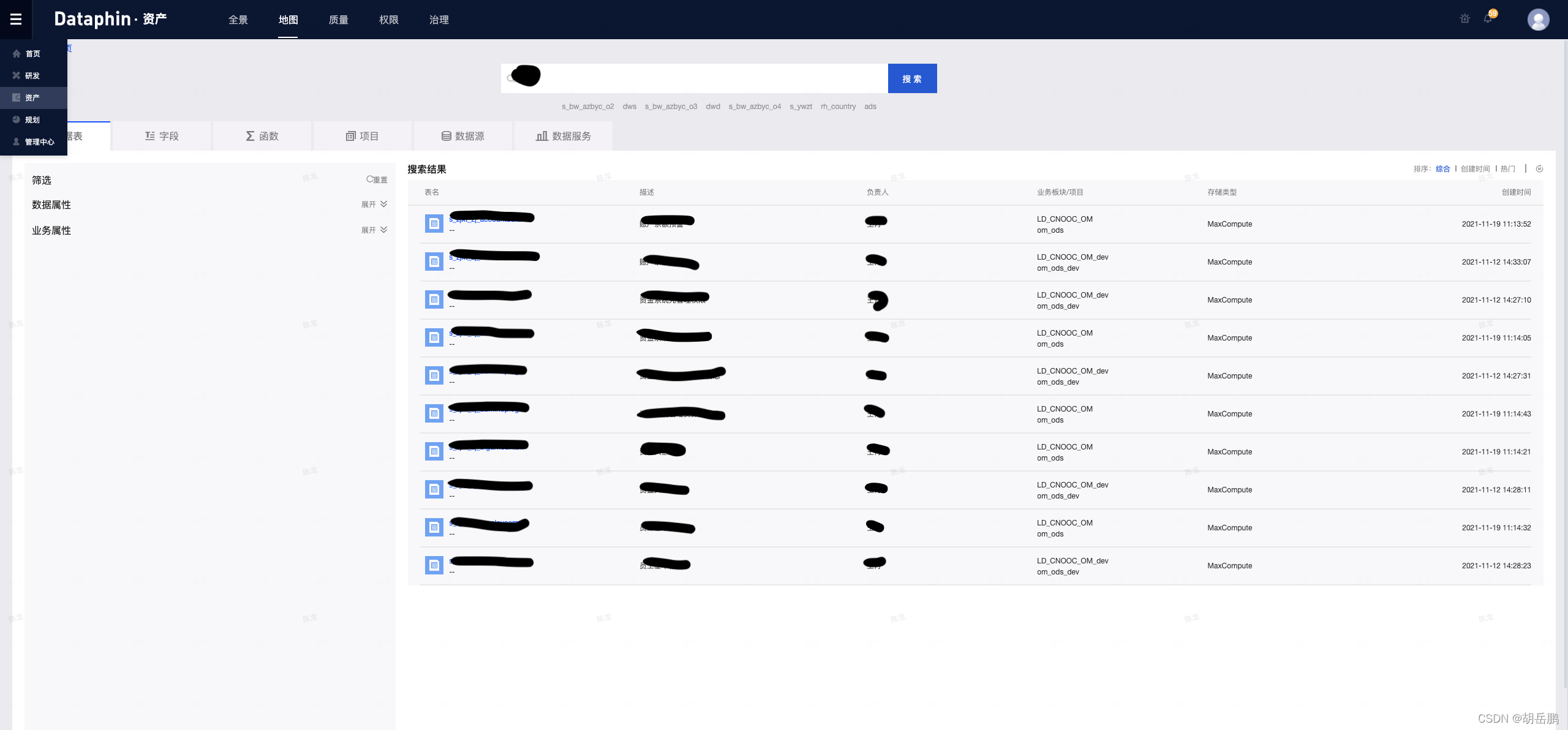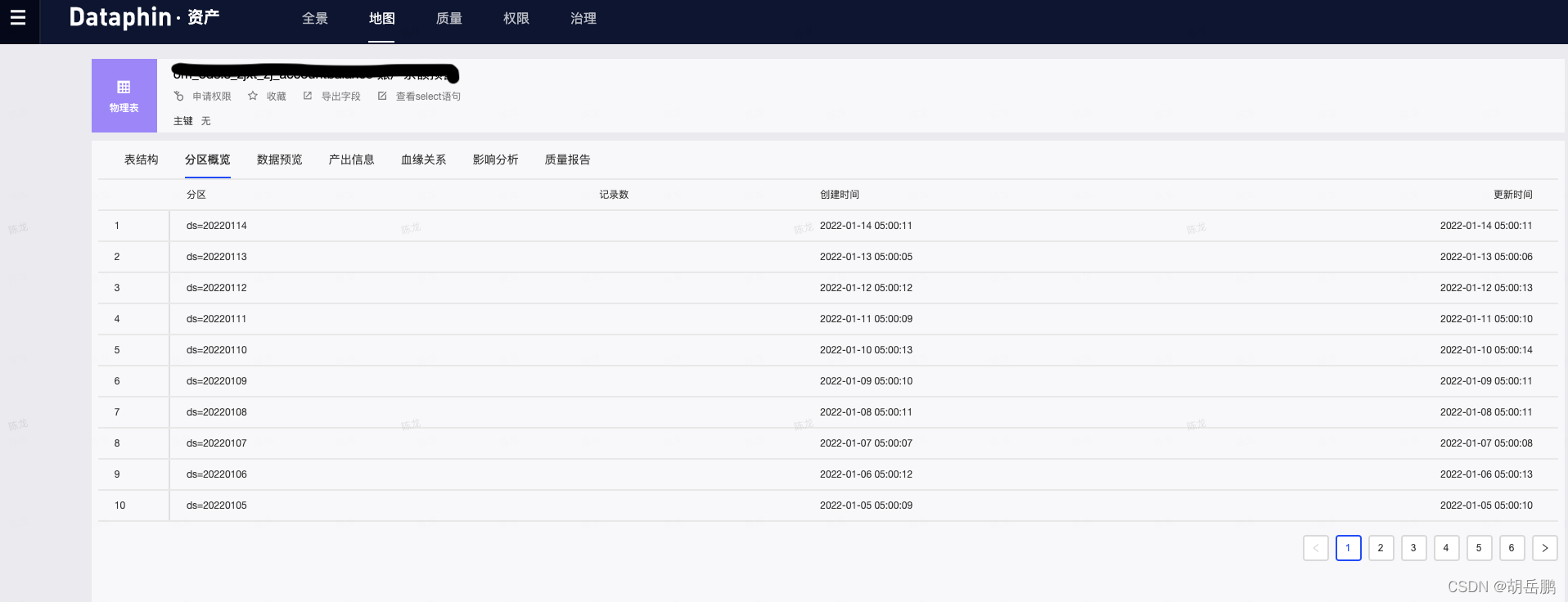 2.在搜索框模糊搜索表格点击相应的表格,即可查询表格相应内容(可以查看表结构、分区概览、数据预览、产出信息、血缘关系、影响分析、质量报告)