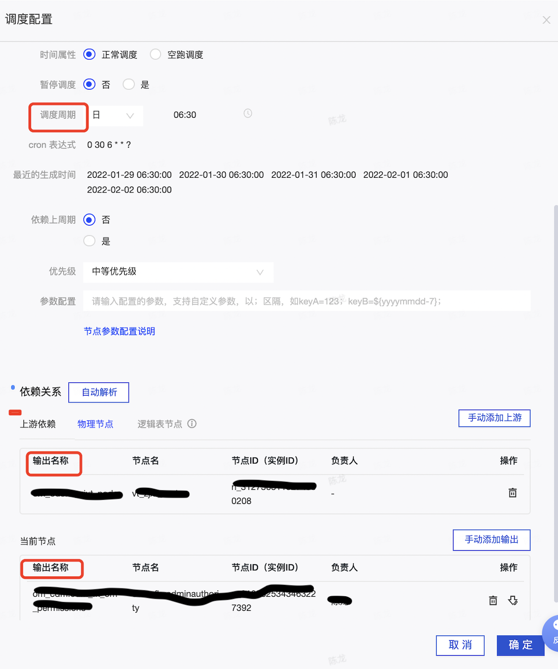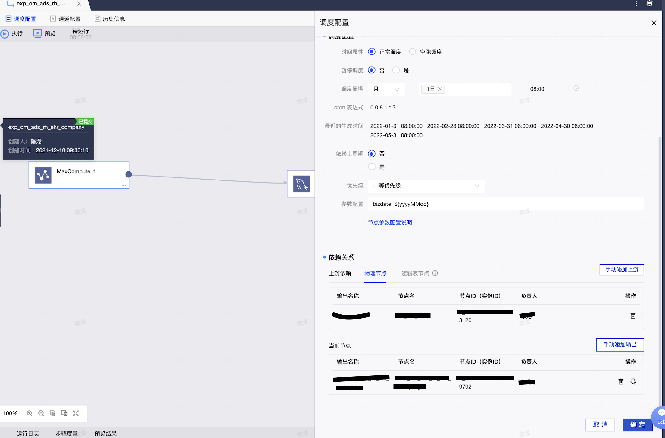点击调度配置,在右侧列表选择时间属性、是否暂停调度、调度周期(最小粒度为5分钟)、上游依赖(需要管理员为你创建一个空节点作为cdm层的上游节点使用)、下游依赖(处理好的数据-->CDM层的目标表)