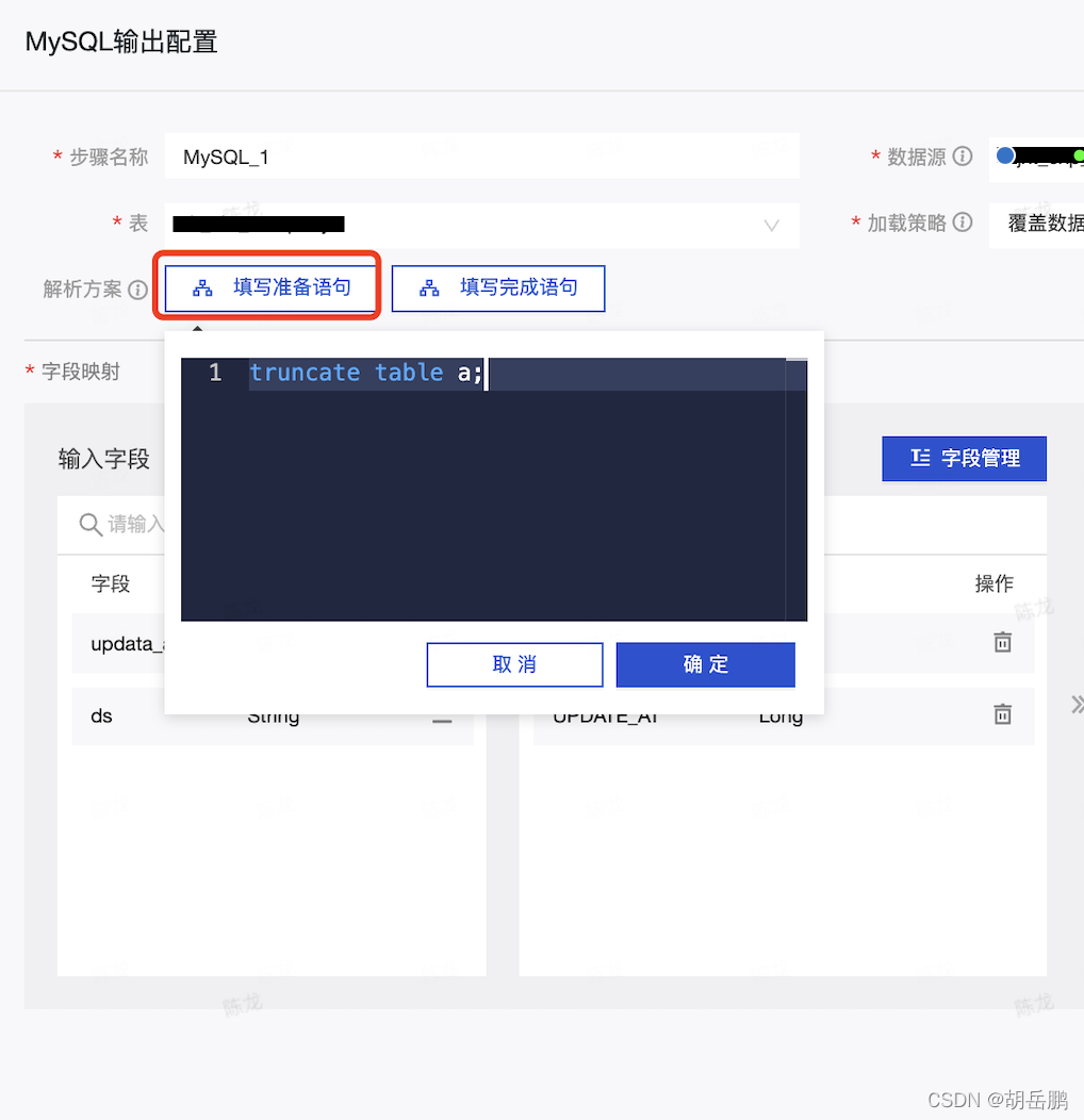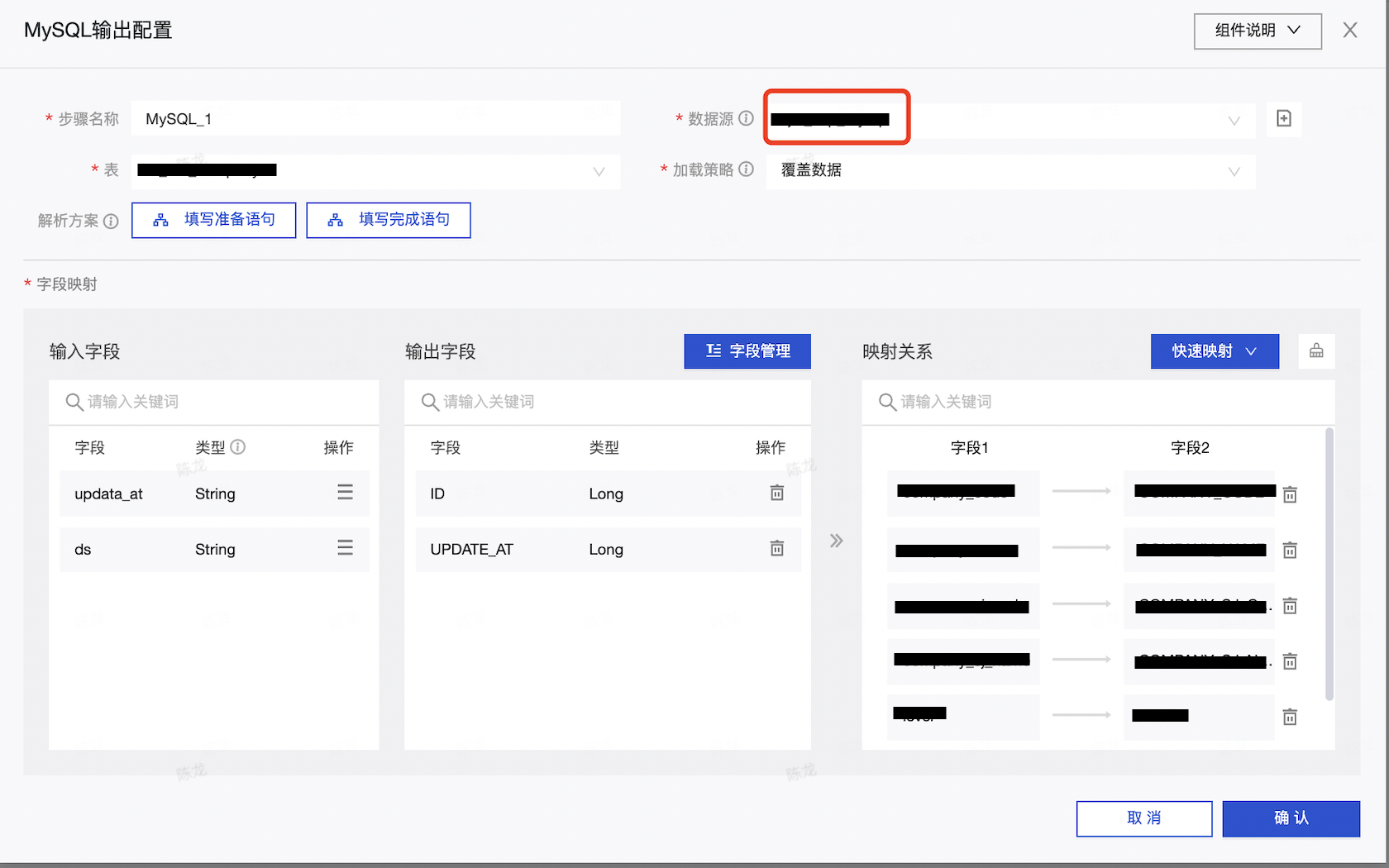 数据源(代表创建的输出端的mysql数据源名称)、表(要导出的表名称)、加载策略(覆盖数据、追加数据)