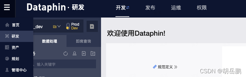 2)开发页面分为规范建模、数据处理、即席查询三大模块