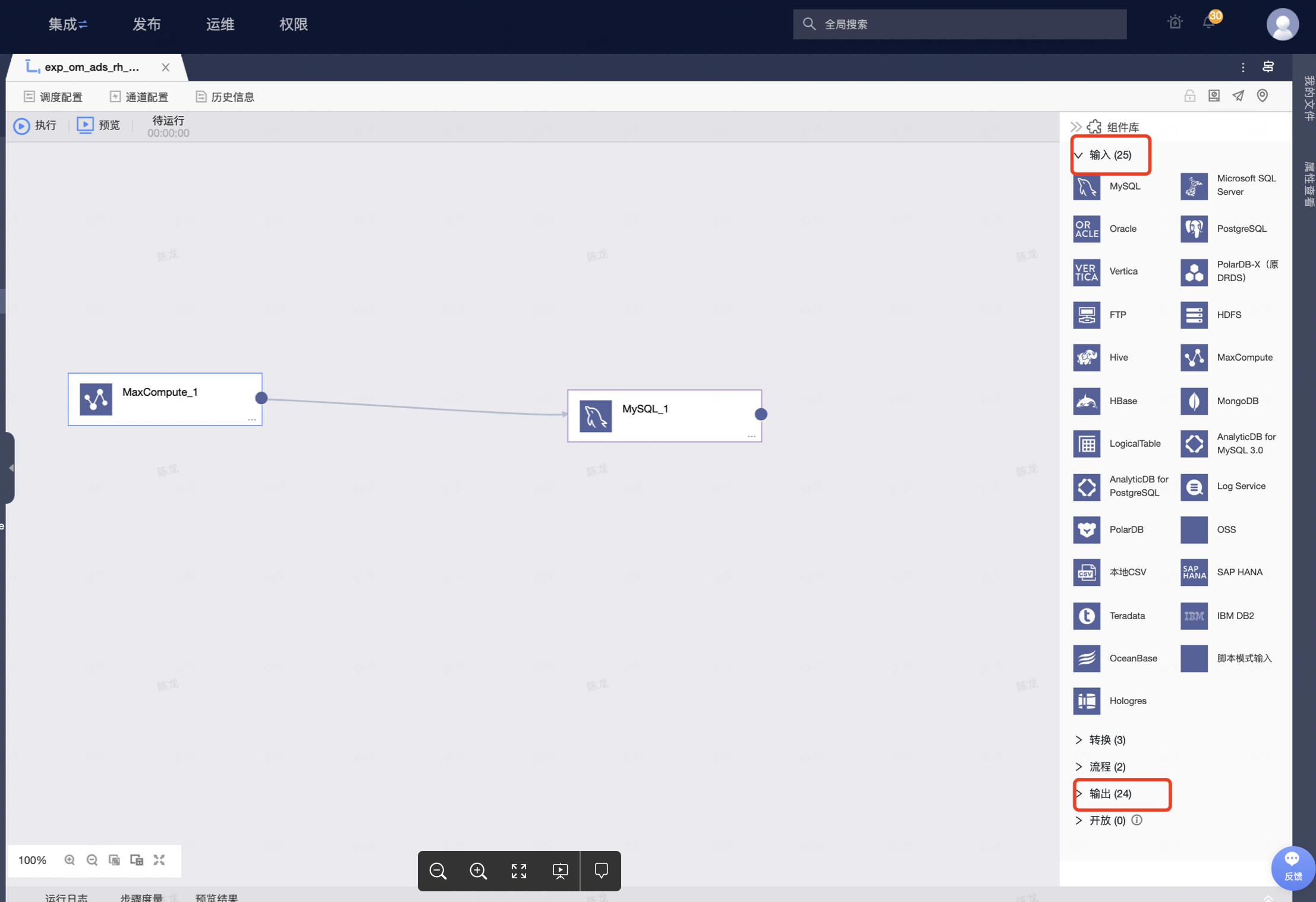 图中咱们输入选择maxcomputer、输出选择mysql为例