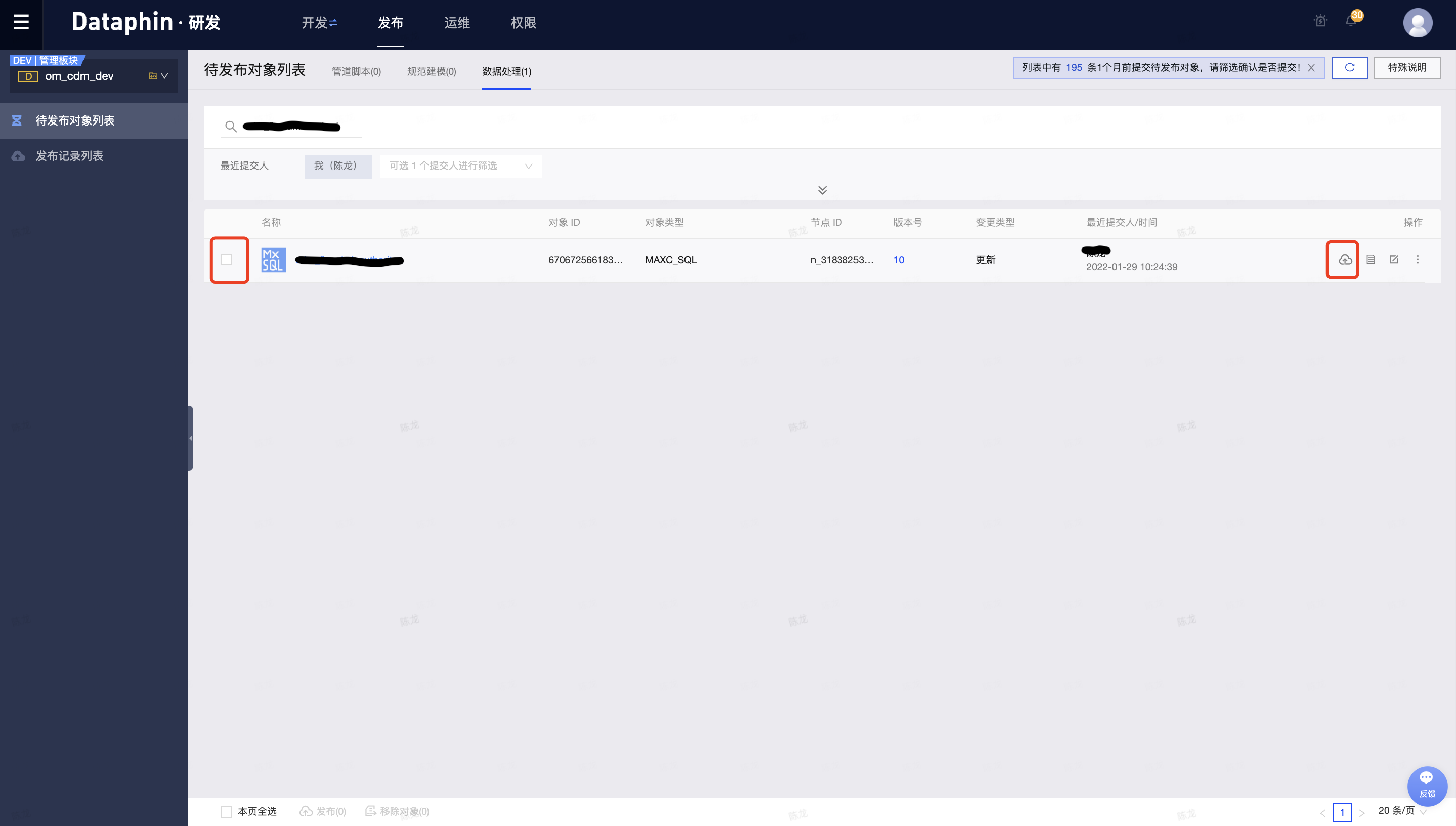1).dataphin拥有开发/测试环境(XX_XX_XX_DEV)和生产环境(XX_XX_XX),使用Dev-Pord模式,将任务调度配置成功之后,进行发布,然后在发布模块,再次进行发布,该任务就会进入到生产