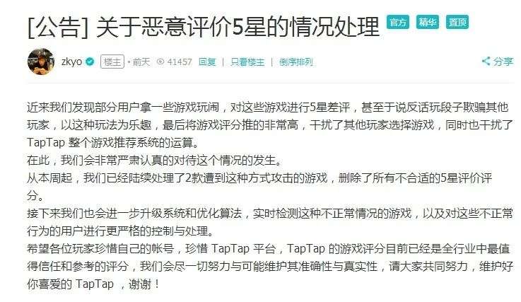 除了“故意差评”,还有“故意好评”,即以说反话、玩梗的形式拉高游戏评分,2018年时TapTap 上的《贪玩蓝月》就曾“中招”,官方不得不发了一则“关于恶意评价5星的的情况处理”声明,去掉冗余评分后游戏评分从8.3分降到了1.8分。