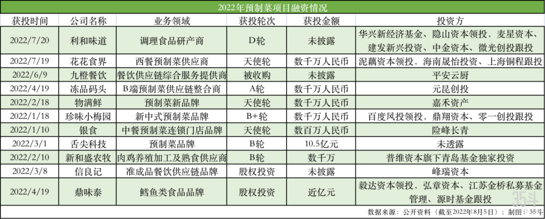 投中数据上半年VC/PE报告显示,“预制菜”与“元宇宙”、“碳中和”等同成为热门赛道之一,被很多新基金重点关注。** **据35斗统计,自2022年以来,共有超11家预制菜相关企业获得融资。融资额最高的莫过于瑞幸咖啡创始人陆正耀创办的舌尖科技,获得了10.5亿元的B轮融资。另仅在7月份,就有花花食界、利和味道两家相继宣布融资进展。