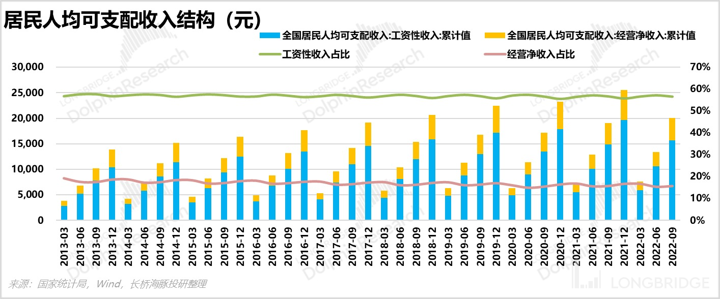 而过去三年(2019Q3 至 2022Q3),全国居民人均可支配收入与其中的工资性收入增长均达到 20%,但是经营净收入增长仅为 15%,也就是说个体工商户的经营能力明显跑输,边际上会加深居民对于收入信心下滑的恐惧,以及经历了去年上半年较为严格的防疫政策(深圳、上海等一线城市长时间的防疫管制),本来经过两年多的抗疫,苦苦支撑的个体工商户们早已是伤到筋骨了。