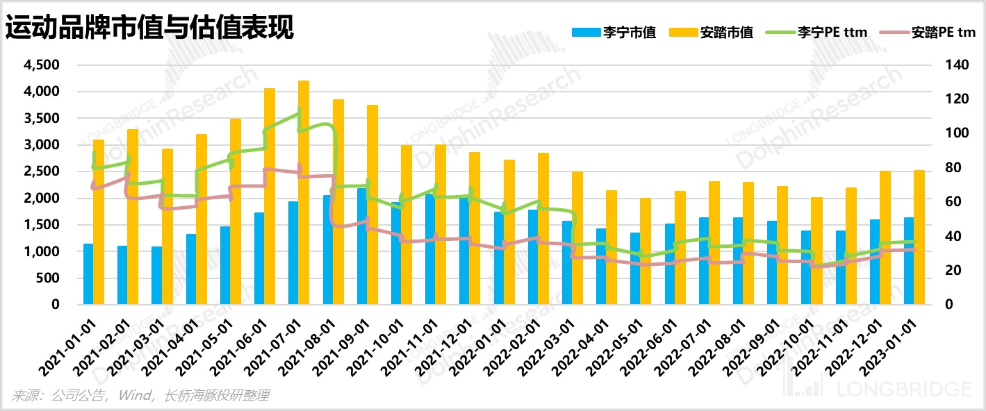 另外,本次海豚君想要给大家分享的是运动品牌细分板块的一些想法。过去两年运动品牌尤其惨淡,不仅是实体业务,港股市场上李宁和安踏,业绩掉的不多,估值掉了大半,主要的原因还是对于客流下降的悲观预期。