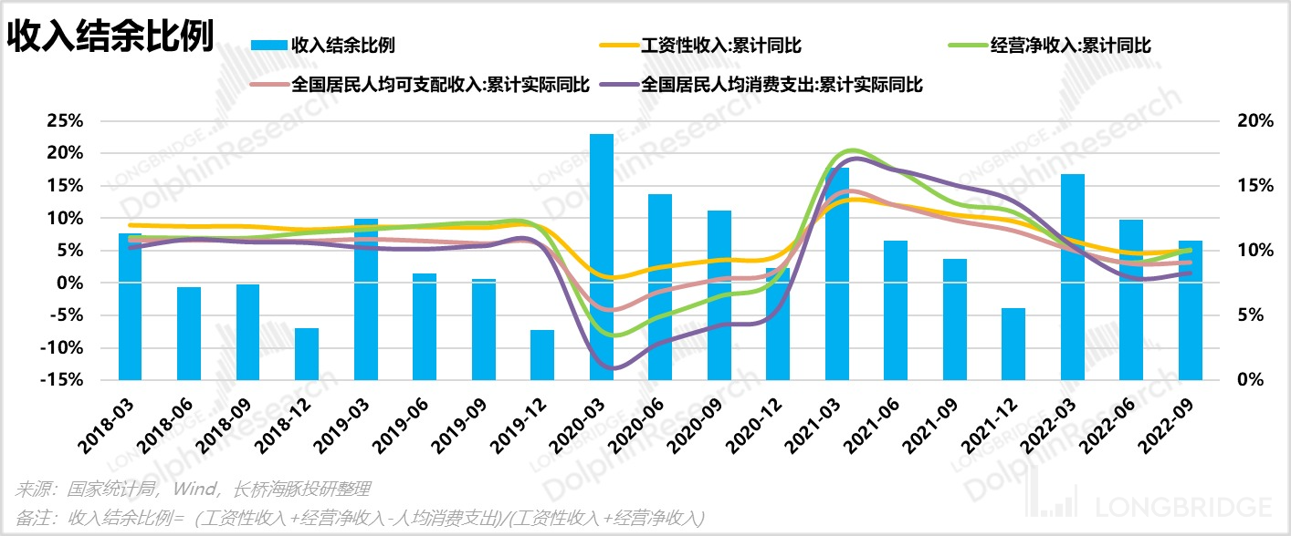 也就是说,现在虽然已经解决了**消费遇冷的第一个问题 “政策管控下造成的消费场景缺失”,但是消费复苏的速度并不如想象中那么理想。但是不同细分领域的恢复差异,也为大家在板块选择上面提供了一些思路,那就是餐饮板块的变化最为明显,这个我们放到后面再详聊。眼下更需要了解的是,会不会即使防疫政策发生优化,依旧出现 “不消费” 的情况呢?这就要探究消费遇冷的另外两个问题,“消费力是否受到损伤” 以及 “降低的消费意愿是否能得到修复”**。