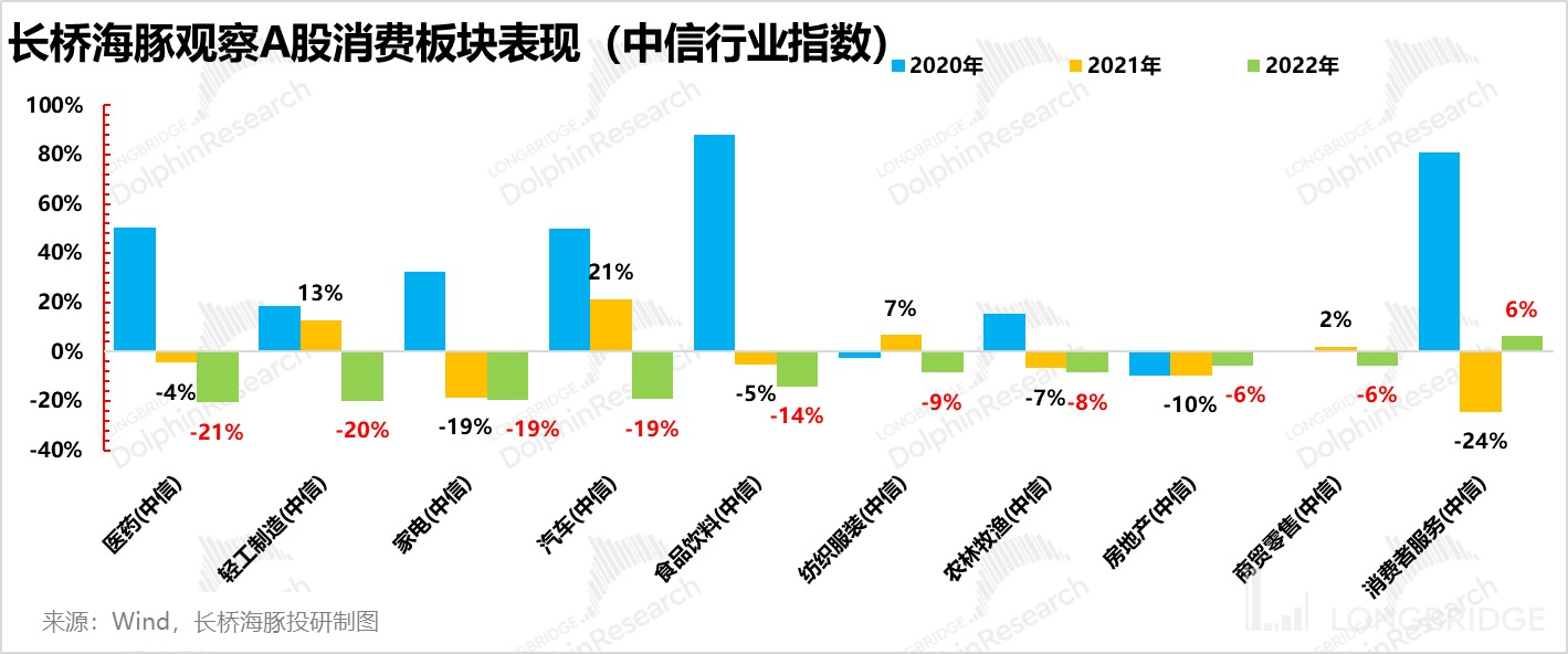 不同于红红火火的 2020,疫情后的第二年和第三年,消费板块的走势与之前天差地别,21-22 年消费板块累计跌幅接近三成。过去两年当中,消费板块的屡次受到冲击,现在越来越少听到消费升级的说法,说到消费,更多谈到的是原材料涨价,费用提升等悲观信息。