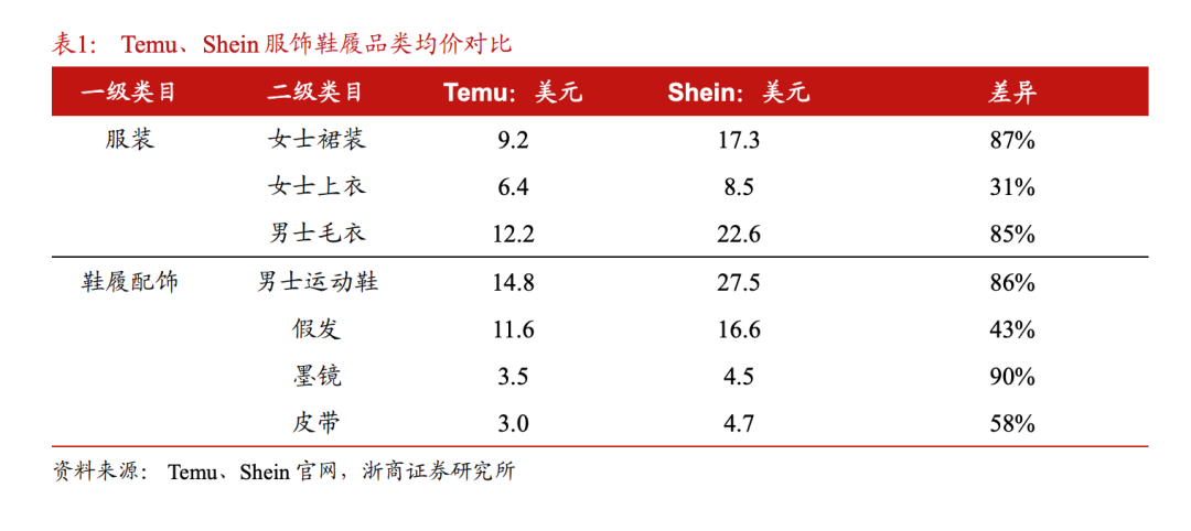 而且如上图所示,目前在服饰鞋包等细分领域,Temu还具备价格优势。