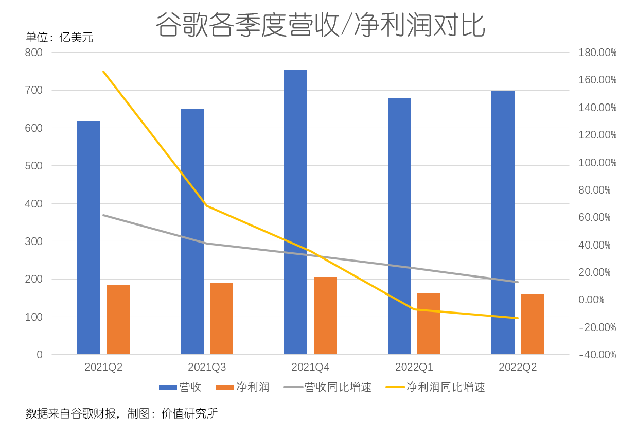 首先看营收数据。财报显示,二季度谷歌总营收为696.85亿美元,同比增长12.6%。不过在营收增速方面,下滑趋势相当明显。去年二季度至今年一季度,谷歌营收同比增速分别录得61.6%、41%、31.4%和23%。对比之下,今年二季度不到13%的同比增速,已经是过去两年来的低点,也低于市场预期的13.52%。