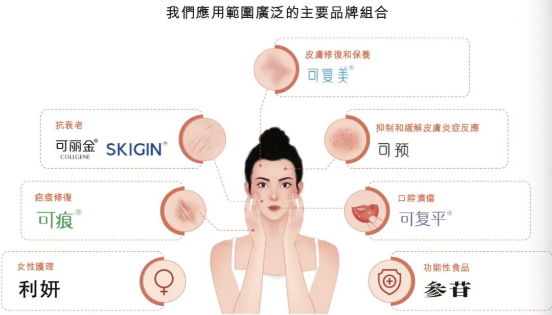 围绕这两大核心成分,巨子生物针对术后修护、初老肌肤、易敏感肌、问题肌肤等问题,从功效性护肤品、医用敷料和功能性食品三大方向,推出了可复美、可丽金、可预、可痕、可复平、利妍、欣苷(SKIGIN)及参苷八大品牌,产品管线包括85款在研产品,产品组合包括105项SKU。