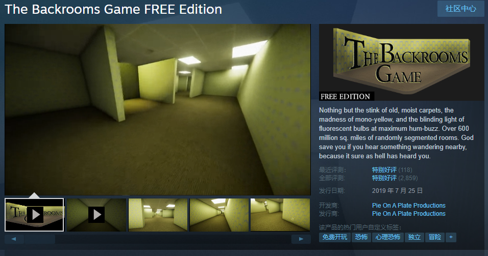 在不断接龙创作的过程中,“后室”的热度也被一些游戏厂商看中。2019 年由独立游戏工作室 Pie on a Plate Productions 开发的同名游戏登录 Steam,在目前 2859 条评论中收获了 85% 的好评率。