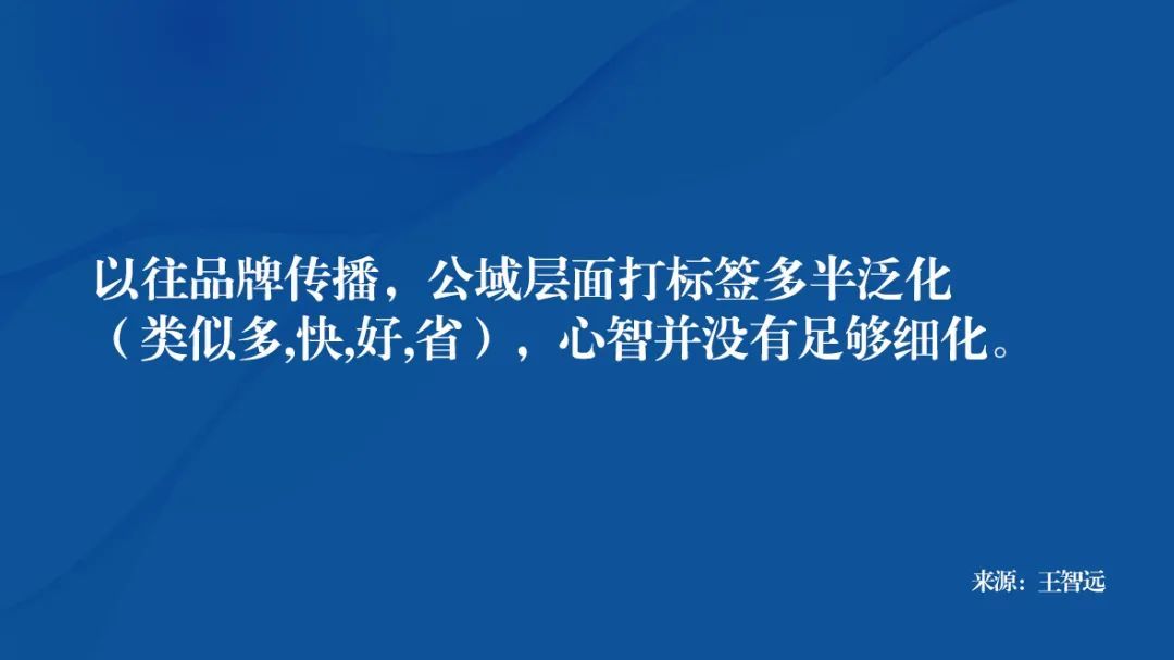 这一切不难看出,以往品牌传播,在公域层面打标签多半泛化(类似、快、多、好),心智并没有足够细化。