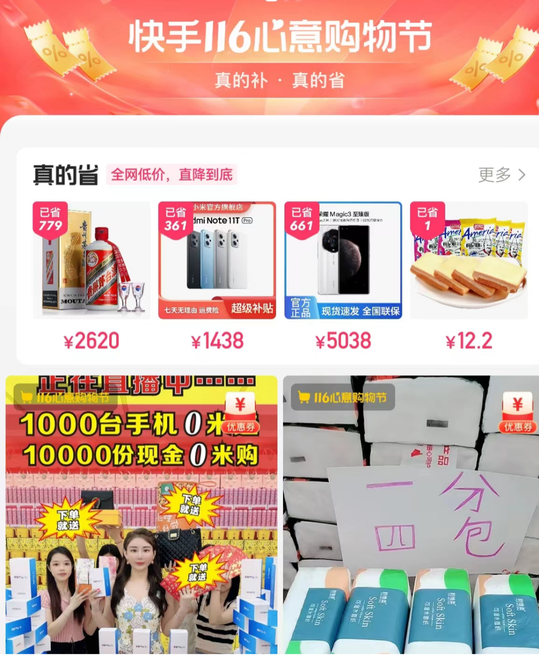 先来看看快手双11的主要玩法。快手把自家平台的双11称为“快手116购物节”。