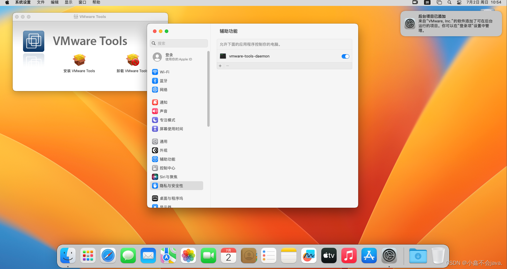 重启后在设置 隐私和安全性 辅助功能中设置允许vmware-tools-daemon控制你的电脑即可