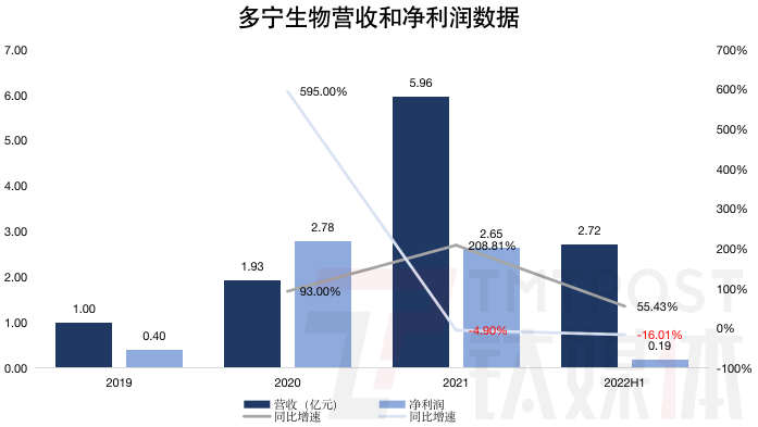 招股书显示,2019年至2021年,多宁生物收入分别为9971.5万元、1.93亿元和5.96亿元,2022年上半年,其收入为2.72亿元,同比增长55.43%,不及此前翻倍增长。