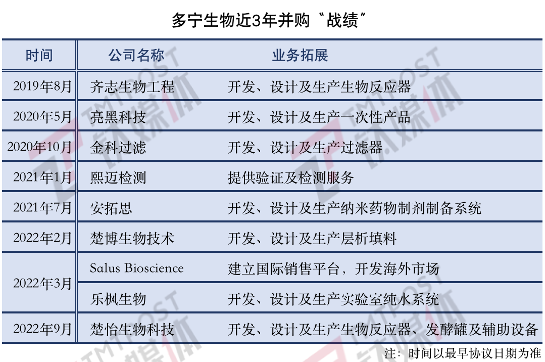根据招股书,从2019年8月开始,多宁生物先后收购及整合了齐志生物工程、亮黑科技、金科过滤、熙迈检测、安拓思、乐枫生物、楚博生物技术、Salus Bioscience及楚怡生物科技,将公司从国产化无血清培养基及新型一次性使用耗材平台发展成了一站式供应平台。