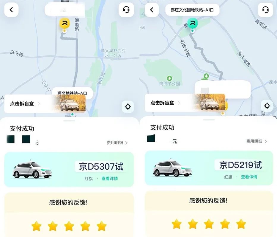 不过经过实地体验,我们发现目前萝卜快跑上运营最成熟,也是部署最多的车型还是第四代红旗EV,北京的亦庄、通州有少量第五代北汽极狐。相比四代车安全员坐在主驾,五代车更贴近外界常提的“无人化”——安全员坐在副驾,方向盘后无人。