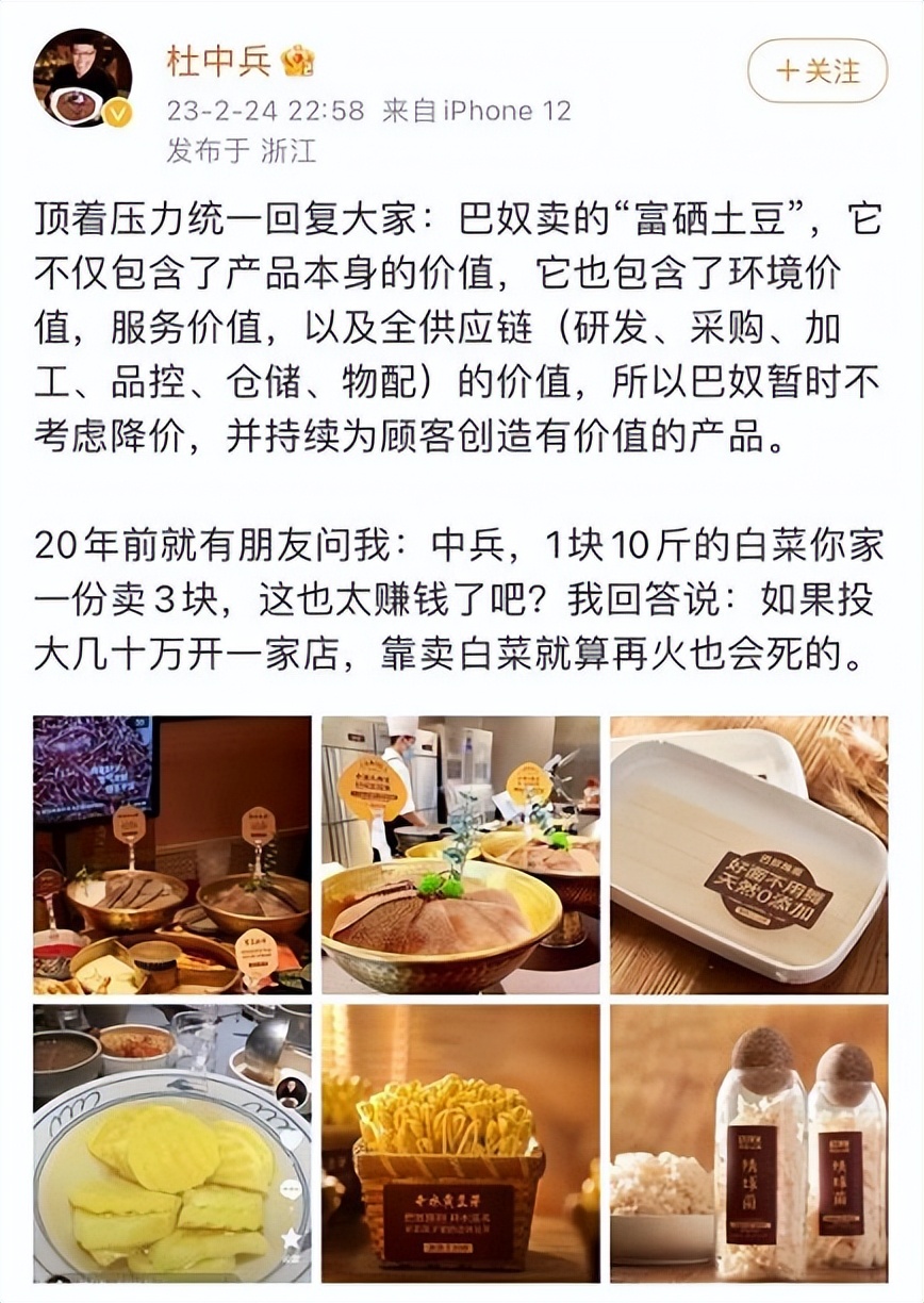 24日,杜中兵再次发文,“该产品不仅包含了产品本身的价值,也包含了环境价值,服务价值,以及全供应链(研发、采购、加工、品控、仓储、物配)的价值,所以巴奴暂时不考虑降价,并持续为顾客创造有价值的产品。”