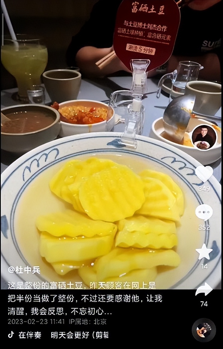 23日,杜中兵发布了视频和朋友圈配文:“这是我在店里拍的整份的富硒土豆,昨天网上顾客把半份当作了整份,不过我还是要感谢他,让我清醒,我会反思,不忘初心。”短视频放上了整份土豆图片,配乐为《明天会更好》。
