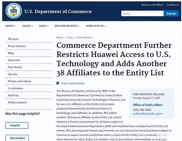 华为子公司被列入美国“实体清单” 美国商务部网站截图