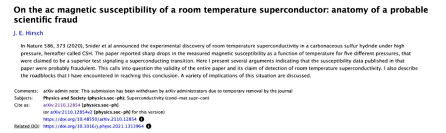 2021年8月25日,一个核心争议点被揪了出来:论文的磁化率数据有问题。简单来说,就是Ranga Dias团队在处理原始数据时,用特殊方法对背景噪声进行了去除,但在论文中却没有针对这一数据处理方法,给出合理的解释。*提出h指数的理论物理学家Jorge Hirsch在验证数据之后,甚至直接质疑Ranga Dias*团队用多项式曲线拟合数据“是一种捏造”,是“一场科学骗局”**。