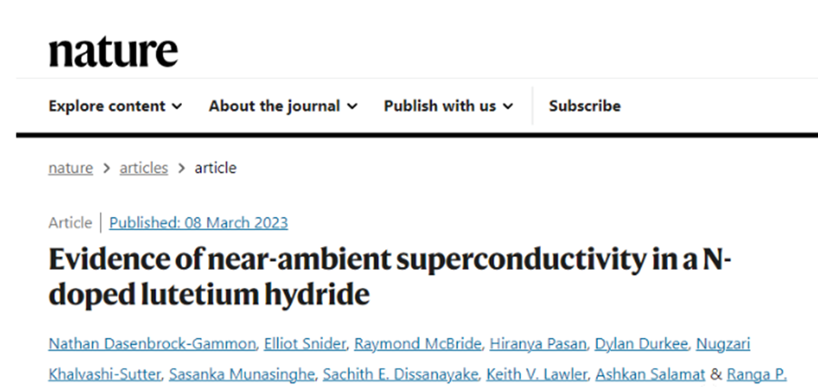 就在Ranga Dias宣布此次成果之后,当地时间 3 月 8 日,相关论文以《氮掺杂氢化镥中近环境超导性的证据》为题发表在 Nature 上。