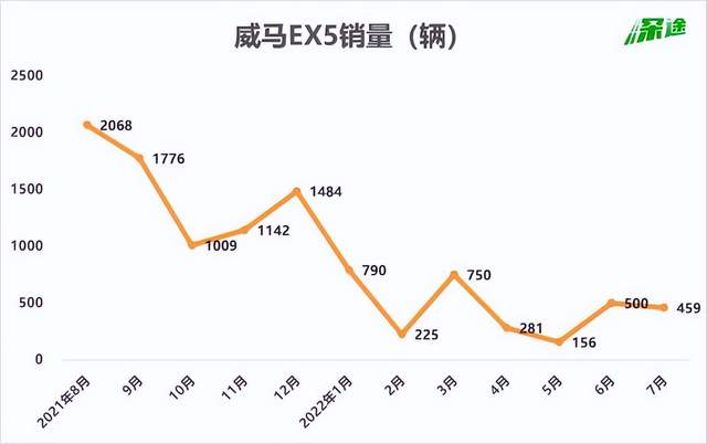E.5正式交付的当月,EX5的月销量从3000掉到2000多,次月掉到1000多,今年初直接回落到1000辆以下。7月,EX5只卖了400多辆。