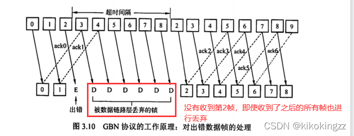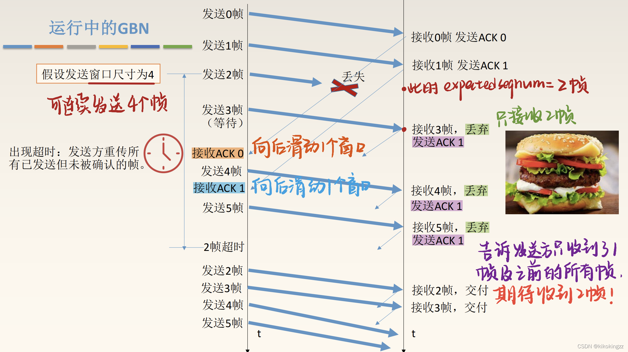 - 后退N帧协议:发送窗口大小>1,接收窗口大小=1。
