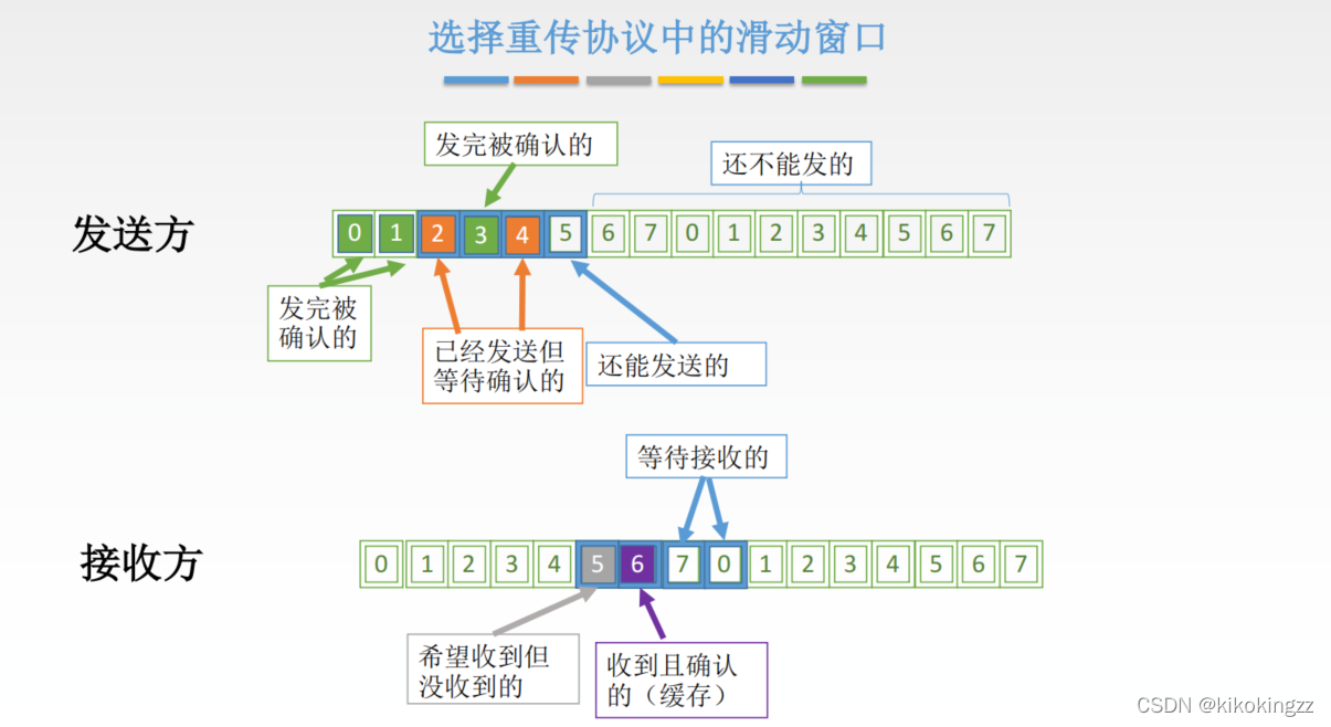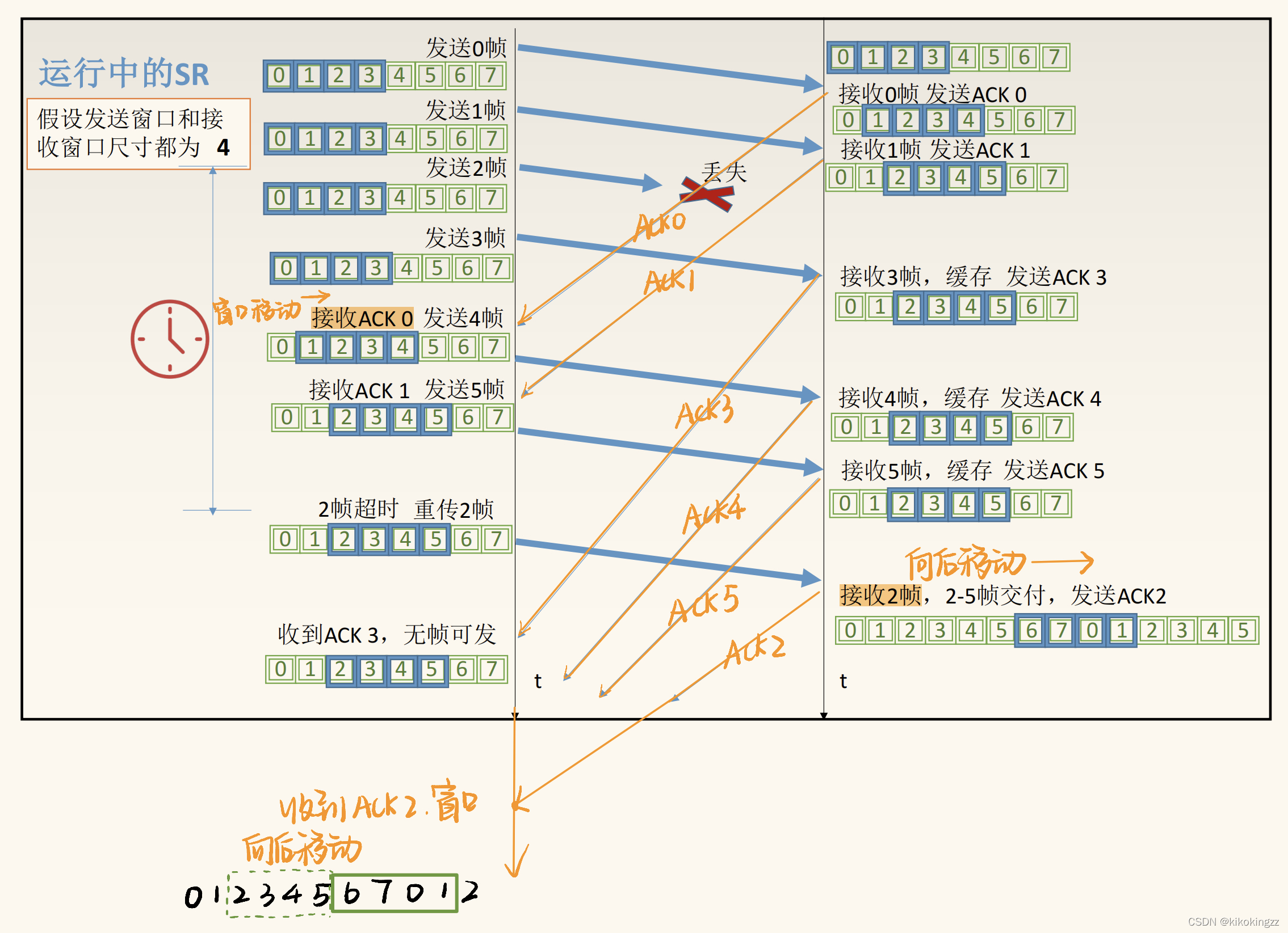 - (1)对于接收窗口内的帧来者不拒:SR接收方将确认一个正确接收的帧,而不管其是否按序。失序的帧将被缓存,并返回给发送方一个该帧的确认帧【收谁确认谁】,直到所有帧(即序号更小的帧)皆被收到为止,这时才可以将一批帧按序交付给上层,然后滑动窗口。