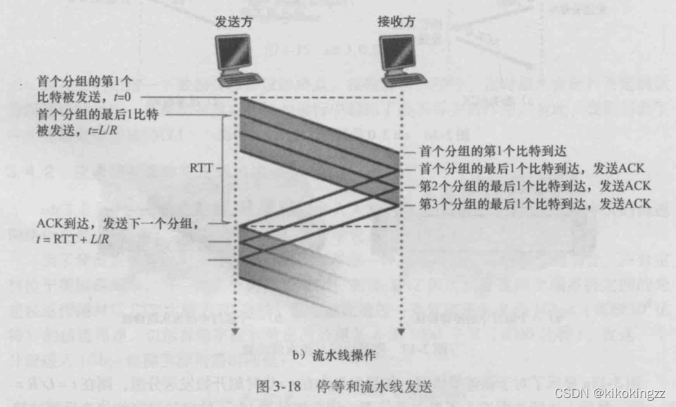 A3:如下图可见,流水线协议中,发送方可以在等待确认之前发送3个报文,其利用率相比停等操作提高了3倍,其与停等协议的区别主要有以下2点: