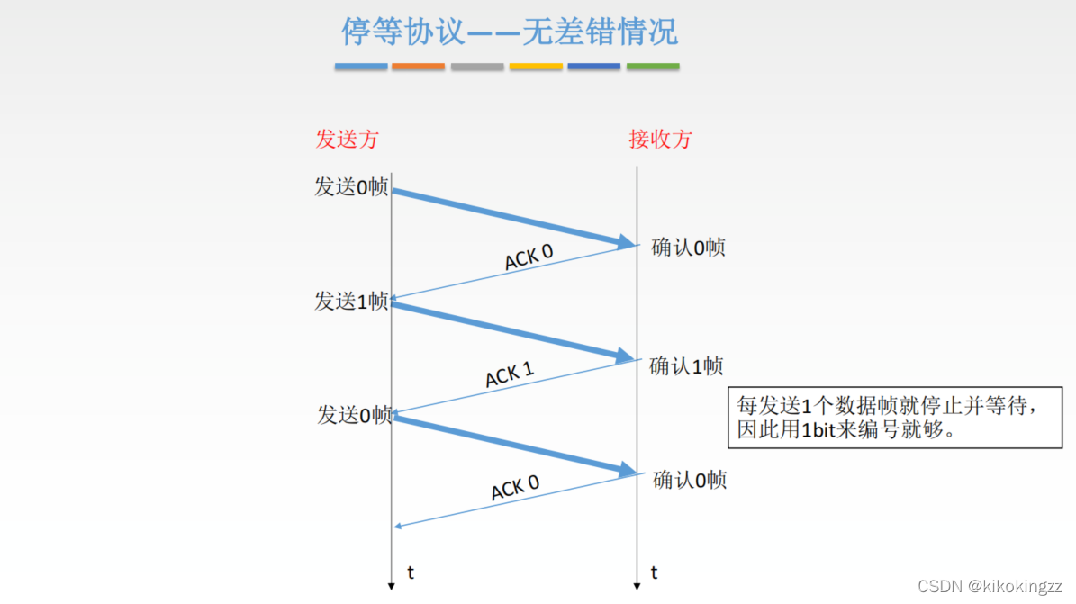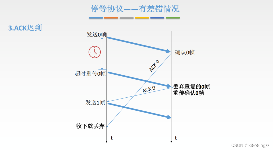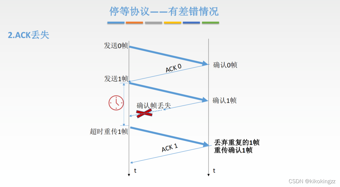 另一种可能的差错是数据帧正确而确认帧被破坏,此时接收方已收到正确的数据帧,但发送方收不到确认帧,因此发送方会重传已被接收的数据帧,接收方收到同样的数据帧时会丢弃该帧,并重传一个该帧对应的确认帧。发送的帧交替地用0和1来标识,确认帧分别用ACK0和ACK1来表示,收到的确认帧有误时,重传已发送的帧。对于停止等待协议,由于每发送一个数据帧就停止并等待,因此用1bit 来编号就已足够。在停止等待协议中,若连续出现相同发送序号的数据帧,表明发送端进行了超时重传。连续出现相同序号的确认帧时,表明接收端收到了重复帧。
