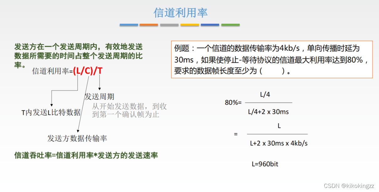 112.一个信道的数据传输速率为4kb/s,单向传播时延为30ms,如果使停止-等待协议的信道 最大利用率达到80%,那么要求的数据帧长度至少为( )。 A.160bit B.320bit C.560bit D.960bit🍊详细题解:
