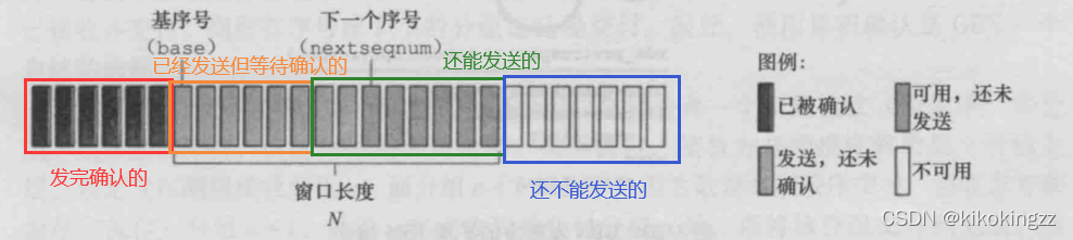 发送窗口:如下图所示,窗口长度N表示可发送的帧数最大为N。