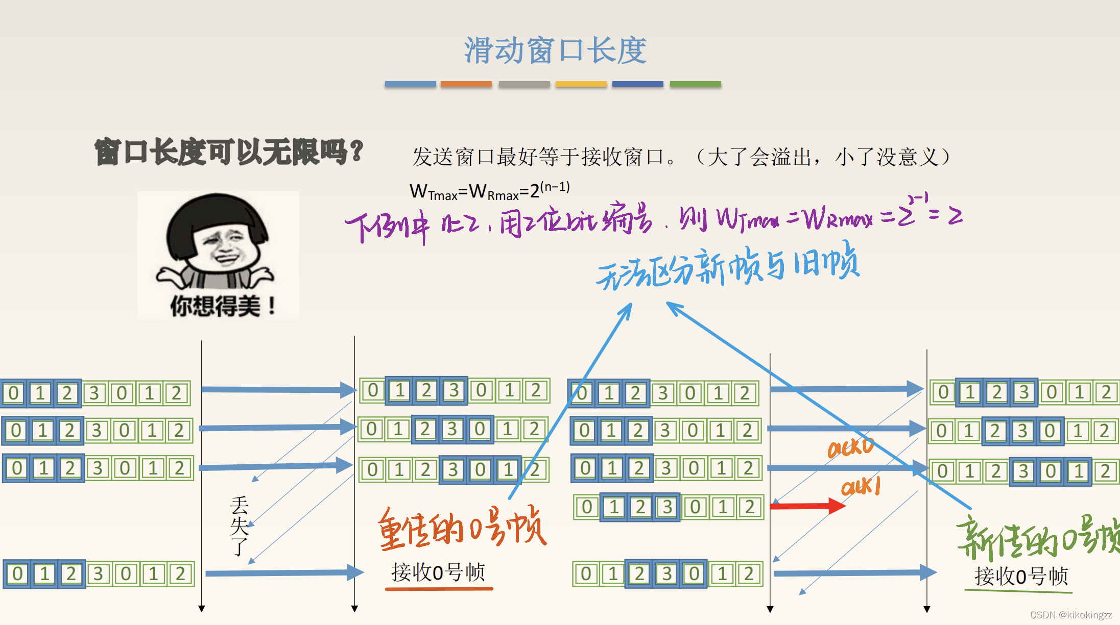 因为如果不满足该条件,即窗口大小大于序号范围一半,当一个或多个确认帧丢失时,发送方就会超时重传之前的数据帧,但接收方无法分辨是新的数据帧还是重传的数据帧,如下图所示,用2bit对帧编号,而窗口大小为3,会出现无法区分新帧与旧帧的情况。