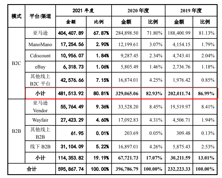 2019年到2021年,致欧通过亚马逊渠道获得的收入(B2C+B2B)分别为20.79亿、31.84亿、46.02亿,收入占比分别为90%、80%、77%。