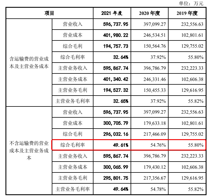 作为一家以外贸出口为主的公司,2020年以来海运运费上涨影响很大,但剔除运费影响后,2019年到2021年,致欧的毛利率仍逐年下滑,分别为55.80%、54.76%、49.61%。