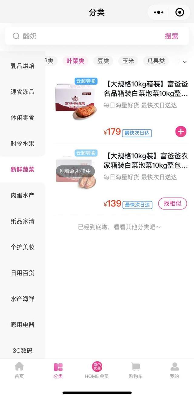 深燃注意到,除了配送时间变更,昨天下午四点多,每日优鲜上的新鲜蔬菜栏里,叶菜类只剩下了整箱的泡菜,其他菜品多为整箱装的红薯,真空包装的玉米,几乎没有了散称的新鲜蔬菜水果。从品类到时效,每日优鲜进行了一次大变身。