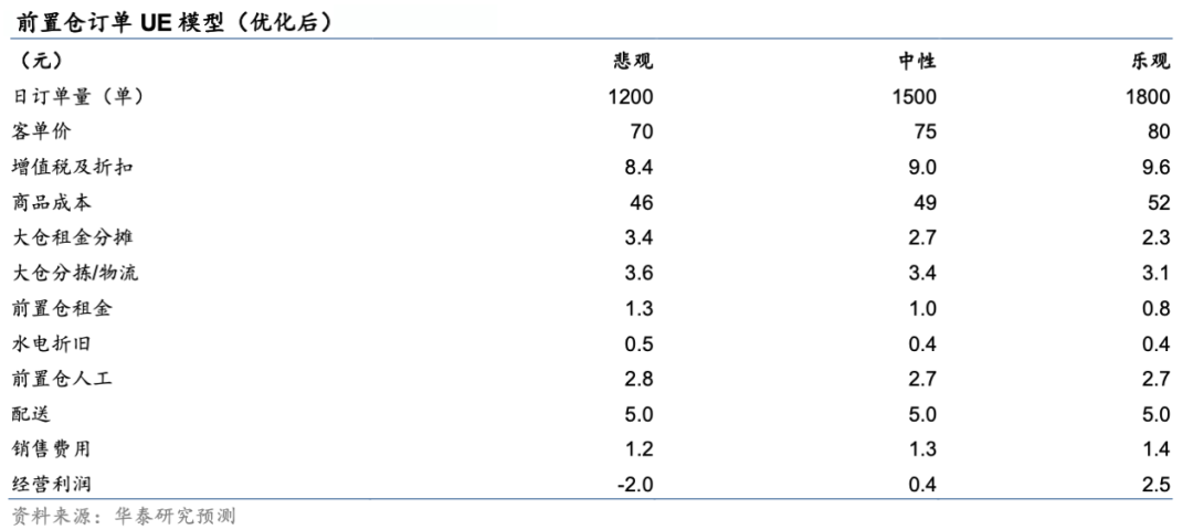 中性优化假设下,单个前置仓订单若达1500单/日,客单价达75元,在不考虑管理和研发费用的前提下,有望实现0.4%的经营利润率。