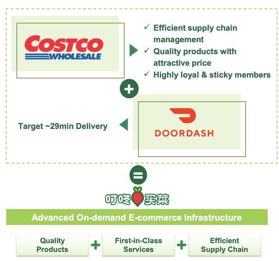 叮咚买菜仍以前置仓作为主要商业模式,在招股书中说自己是Costco+Doordash的结合,其中Cotsco代表了高效的供应链管理体系、高性价比商品,以及高粘度的付费会员,盈利模式以会员费为主;而 Doordash是美国目前最大的外卖平台,优势是29分钟送达的确定性履约能力。
