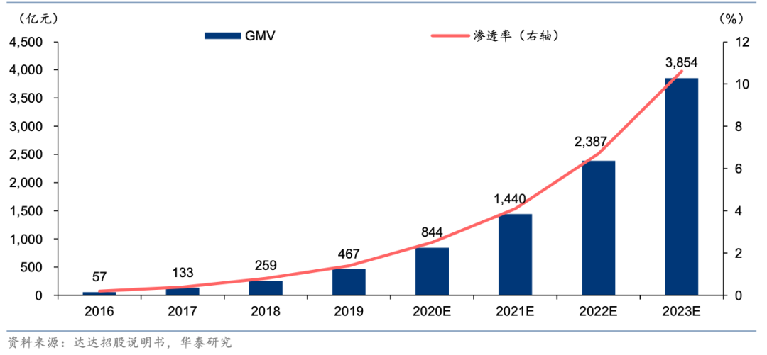 如果按照即时零售在网购的渗透率来测算,2020年,我国实物商品网络零售总额达9.8万亿元,据美团研究院,其中即时零售渗透率达1.5%,即时零售市场规模达1463亿元。