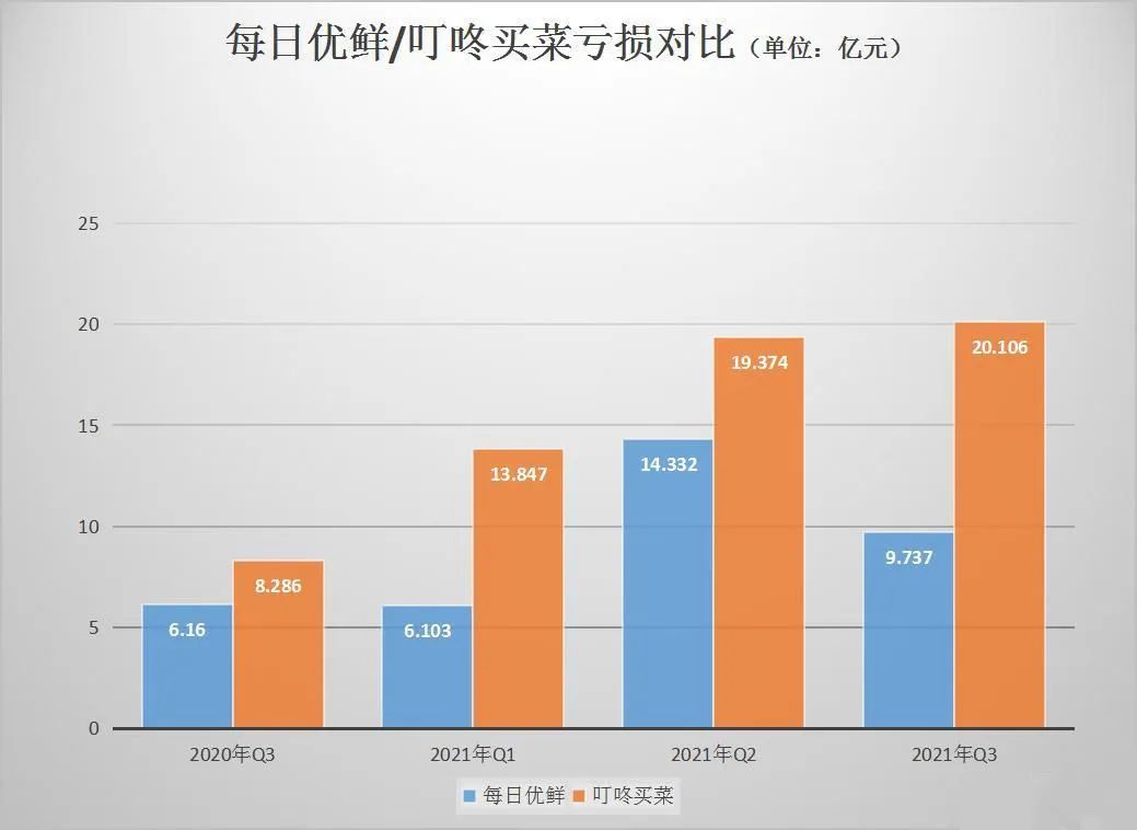 2021年Q3的财报显示,叮咚买菜的收入达到近62亿元,而每日优鲜只有21.2亿元。