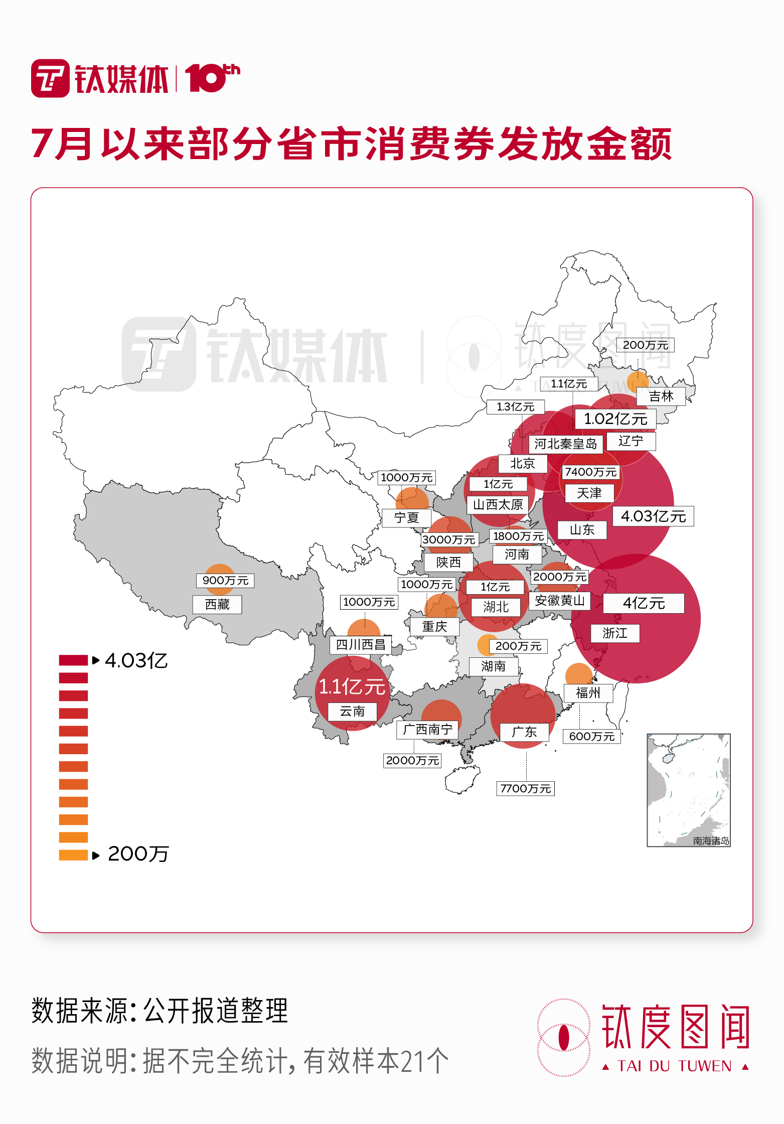 据钛媒体·钛度图闻不完全统计,7月以来,全国共有21个省市计划发放消费券,发放金额从百万至上亿不等。截至7月20日,发放总额近18亿元。其中,金额上亿的省市占比近4成。山东省将连续发放2亿家电券和2亿乘用车消费券;浙江宁波和金华也将分别发放3亿和1亿消费券。