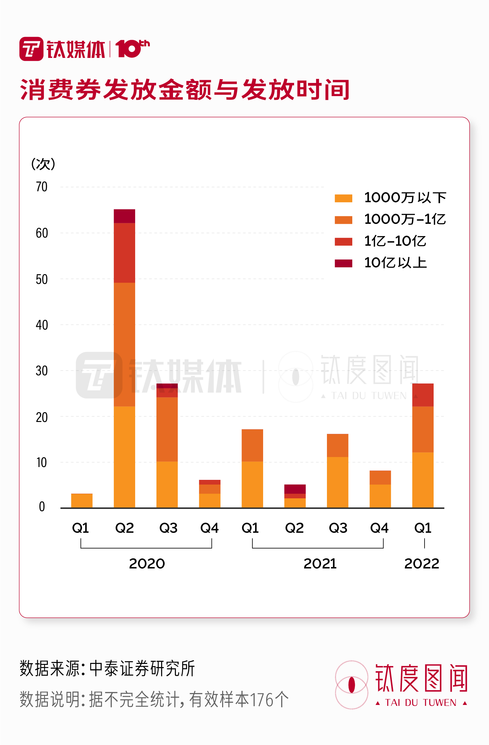从消费券发放金额上看,金额数为1000万以下的消费券每个季度均有发放,发放次数占比达45%,仅有3个季度发放了金额数为10亿以上消费券,发放次数仅占3.4%,可以看出消费券发放更倾向于小额多次。