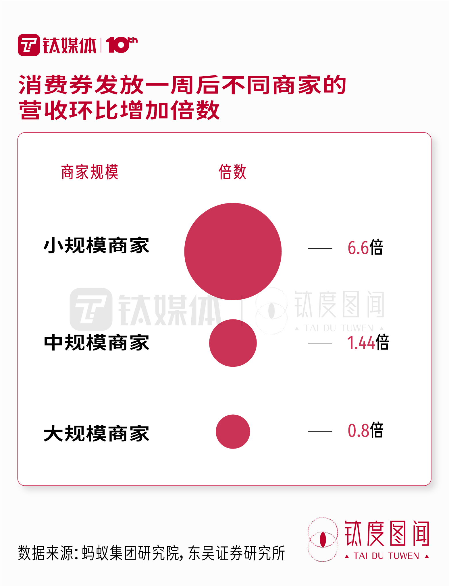 除了提振经济,消费券对商家营收的恢复也有一定的影响。从商家规模来看,规模越小的企业越受益。据中国财政科学研究院和蚂蚁集团研究院测算,将年销售额 30 万元以下的商家划分为小微企业,87%的消费券会流向小微企业。以一周为时间维度,相比发券前一周,小规模商家经营流水环比增加最多,增加了 6.6 倍,而中、大规模商家增加倍数则逐渐递减。