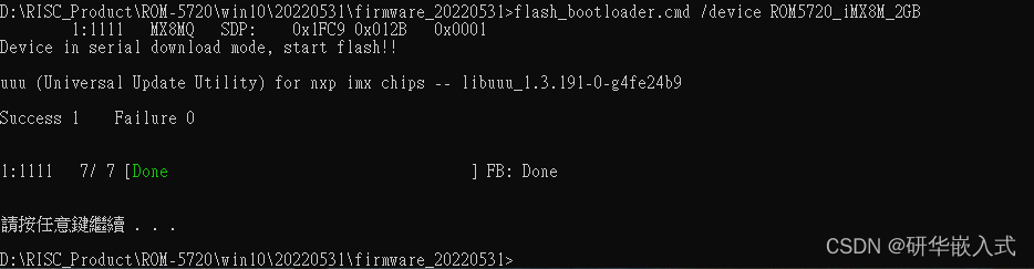 (4)输入任意键后,关闭设备电源,离开烧录进程,启动加载程序的过程就完成了