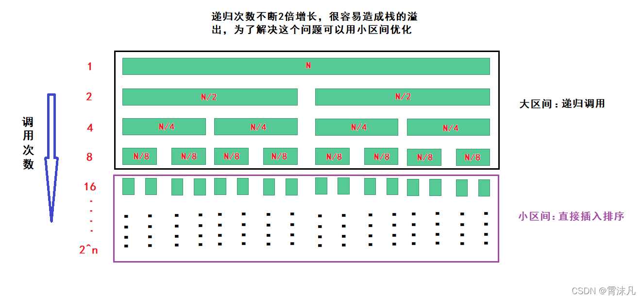 if (right - left + 1 < 10) { InsertSort(a + left, right - left + 1); } else { int keyi = Partion1(a, left, right);/*hoare版本*/ //区间划分[begin , keyi-1] keyi [keyi+1 , end] QuickSort(a, left, keyi - 1); QuickSort(a, keyi + 1, right); }由于采用递归的方式进行快排,如果数据量很大,就会造成栈的溢出;为了解决这个问题,采用了一个小区间优化的方法,在不断划分区间去进行递归的时候,越往下划分区间越来越小,但是区间数量越来越多,递归次数也越来越多;我们采取当区间相差小于10(最低给10)时,直接让这些区间的数据进行直接插入排序;